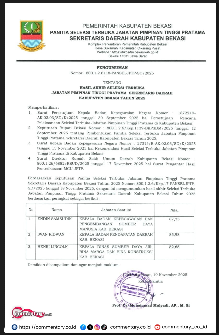 Kabupaten Bekasi,Commentary-Panitia Seleksi Terbuka Jabatan Pimpinan Tinggi Pratama (JPTP) Sekretaris Daerah Kabupaten Bekasi resmi mengumumkan tiga peserta dengan nilai tertinggi dalam tahapan seleksi Sekda Kabupaten Bekasi Tahun 2025. Pengumuman tersebut tertuang dalam surat Nomor: 800.1.2.6/18-PANSEL/JPTP-SD/2025 yang diterbitkan pada 19 November 2025.